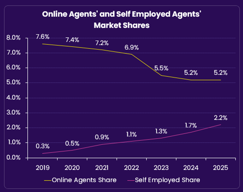 We’ve been closely monitoring the market share of both groups and observed the self-employed agents’ market share rise from 0.3% in 2019 to 2.2% in 2025. Between 2024 and 2025 alone, market share jumped up by 27%. Conversely, the online agent market share has fallen to 5.2% last year compared to 7.6% in 2019, a decline of 32%.
