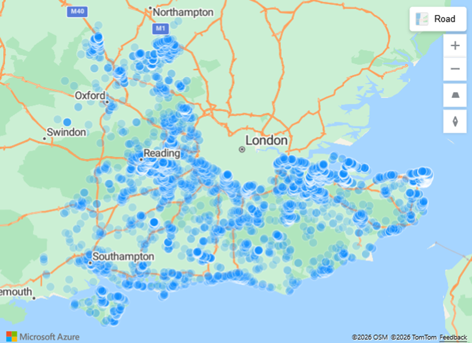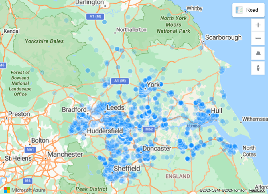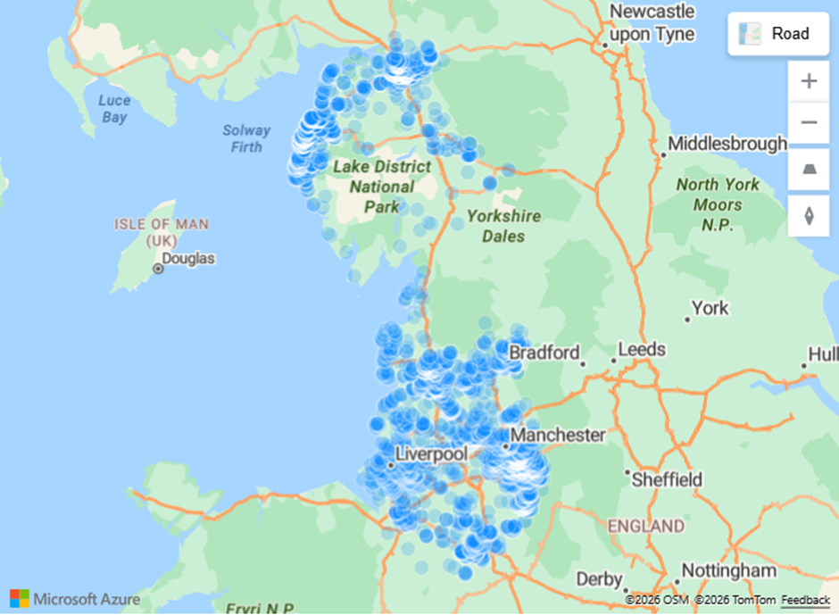 In the North West, instructions are heavily concentrated around Manchester and Liverpool. There’s also a notable cluster of instructions in and around Carlisle.