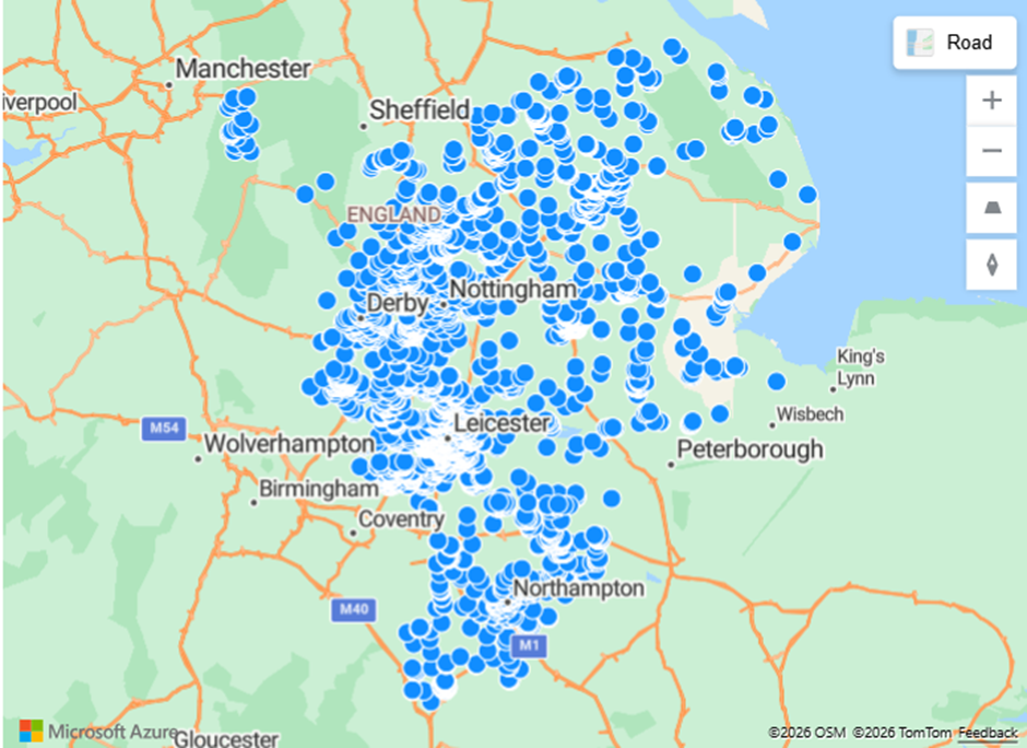 For the East Midlands, the map highlights healthy levels of instructions spread out throughout the region. There are notably high instructions in Leicester, Lincoln and Grantham, with opportunities to take market share in Nottingham.