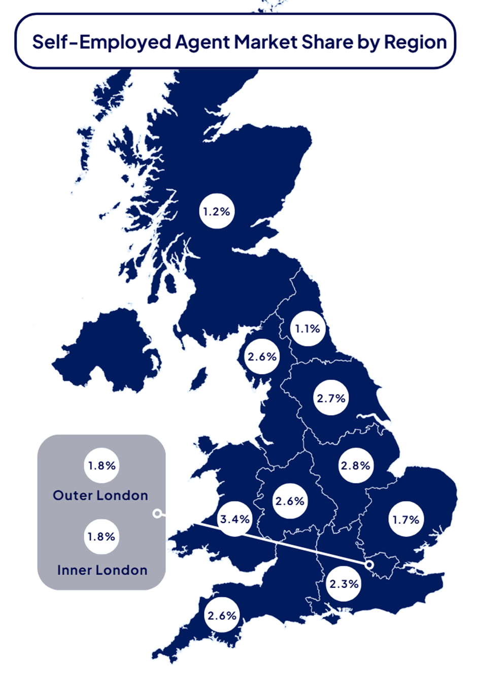 The map below shows the regional breakdown of self‑employed sales market share. Wales leads with 3.8%, followed by the East Midlands at 2.8% and Yorkshire and The Humber at 2.7%. At the other end of the scale, the North East trails with just 1.1% held by self‑employed agents.